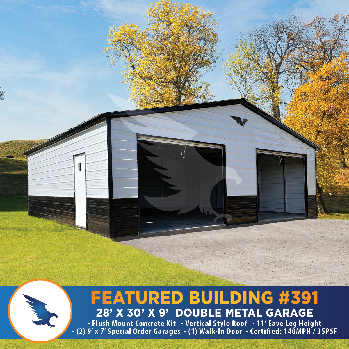 This 28x30x9 Double Metal Garage is built with a Black Roof Vertical Style Roof with Black Trim