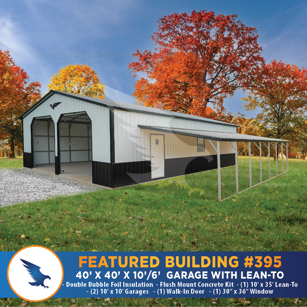 This 40x40x10/6 Garage with Lean-To is built with a Black Vertical Roof with Black Trim, 6′ Eave Leg Height